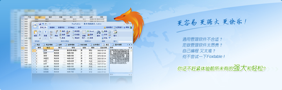 如果有人告訴你,有這樣一款軟件,不管你有沒有基礎,只需一周左右的時間就能讓你成為一個數據管理高手,而且其數據錄入之快捷、統計查詢之強大、報表輸出之多樣,目前市面上的軟件無出其右;同時只要你愿意,它可以立即變身為一個開發平臺,而且從PC到手機、從C/S到B/S、從客戶端到服務端、從單機到局域網再到互聯網、從常規的數據管理到文檔管理、從單業務管理系統到企業整套ERP,包括企業IM,它都能勝任開發,并且可以編譯成獨立的可執行文件。它不僅簡單,而且高效,高效到一人可抵一個小團隊;它能讓一個完全沒有接觸過編程的職場菜鳥,在3個月甚至更短的時間內蛻變為一個管理軟件開發的全棧工程師。你可能不會相信,真的有這樣的軟件嗎?有,就是Foxtable!Foxtable將Excel、Access、Foxpro、VB以及易表的優勢融合在一起,無論是數據錄入、查詢、統計,還是報表生成,都前所未有的強大和易用,普通用戶無需編寫任何代碼,即可輕松完成復雜的數據管理工作,真正做到拿來即用。同時Foxtable又是一個高效開發工具,專門針對數據管理軟件的開發作了大量的優化,使得用戶在開發過程中只需關注商業邏輯, 無需糾纏于具體功能的實現,這樣Foxtable不僅開發效率十倍于其他專業開發工具,而且更加易用,幾乎人人都能掌握。讓普通人開發出專業水準的管理軟件,以前是一個不可思議的想法,而Foxtable的出現,讓這成為現實。而且Foxtable內置了HTTP服務和手機網頁生成功能,用戶不需要任何專業知識,甚至可以完全不懂網頁設計,也能快速開發出手機端的管理軟件。此外,Foxtable不僅內建數據庫,還支持Access、SQL Server、Oracle等主流數據庫作為外部數據源,并提供了數據動態加載、后臺統計等功能,使得相距千里的不同電腦協同處理數據,以及海量數據管理,非專業人士也能輕松應付,從而讓普通人也能快速開發出各種基于互聯網的管理系統,如進銷存、MRP、ERP、OA、CRM、SCM、MIS系統等等。不僅如此,FoxTable還同時具備B/S和C/S架構的優勢,可以像B/S軟件一樣易于部署,同時又具備C/S軟件良好的用戶體驗和交互性。經過十年的發展,目前國內已經有數萬企事業單位成功利用Foxtable自行開發管理系統,不再受制于軟件公司,不少單位節省了以十萬甚至百萬計算的費用;同時也發展了一大批個人愛好者,這些愛好者很多都是企業管理人員,熟悉管理和業務邏輯,以前苦于沒有合適的開發工具,無法根據自己的需要自行開發系統,Foxtable的出現,讓他們如虎添翼,紛紛開發出適合自己企業的管理軟件,讓領導和同事刮目相看,大大提高了自己在職場的競爭實力,一些用戶因此改變了自己的職業生涯甚至人生。 [ + 展開 ]